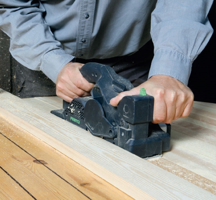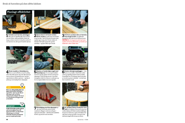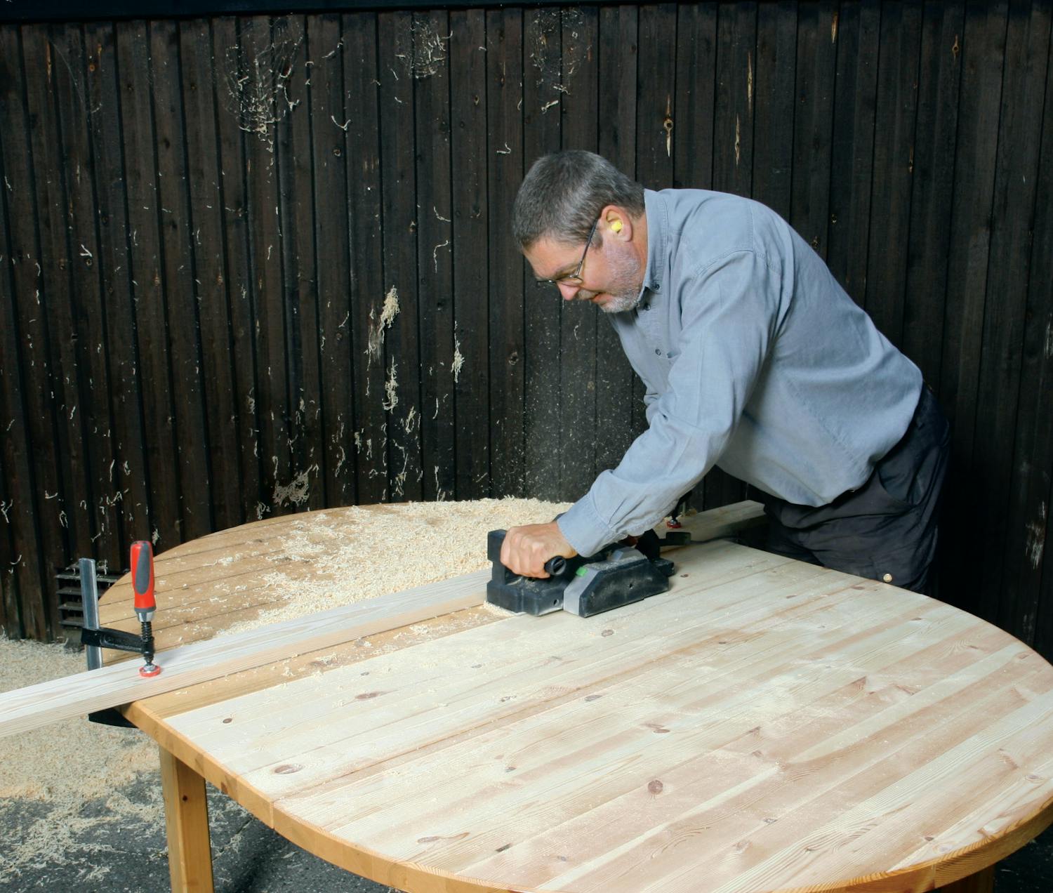 Ved hver posisjon føres el-høvelen fram langs bordet i en glidende bevegelse slik at den tar et helt jevnt spor.