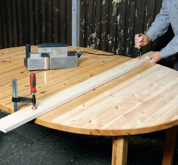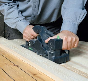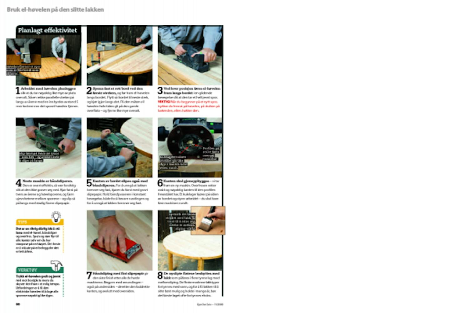 Spenn fast et rett bord ved den første streken, og før fram el-høvelen langs bordet. Flytt så bordet til neste strek, og kjør igjen langs det. På den måten vil høvelen hele tiden gli på den gamle overflata - og fjerne like mye overalt.