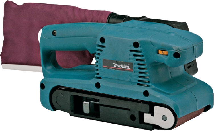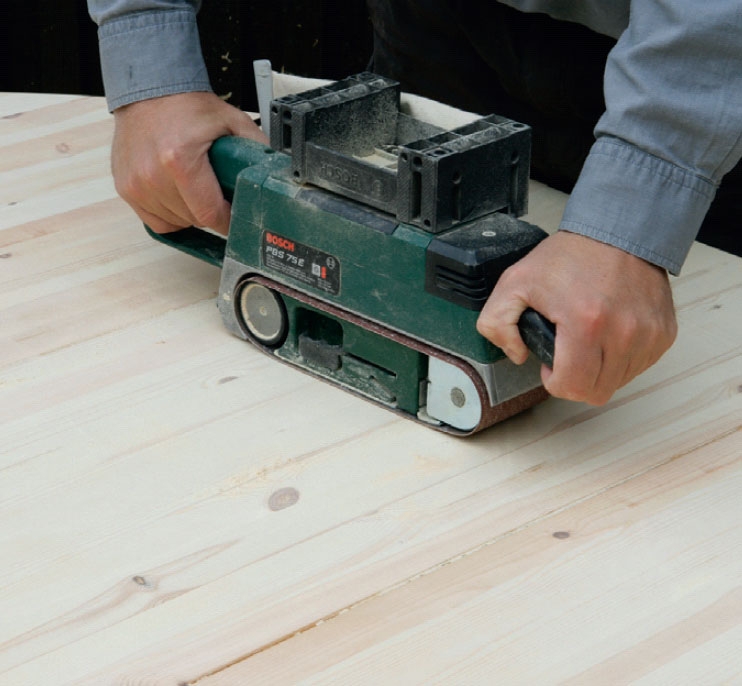 Neste maskin er båndsliperen. Den er svært effektiv, så vær forsiktig slik at den ikke graver seg ned. Kjør først på tvers av årene og høvelsporene, og fjern ujevnhetene mellom sporene - og slip så på langs med stadig finere slipepapir.