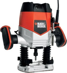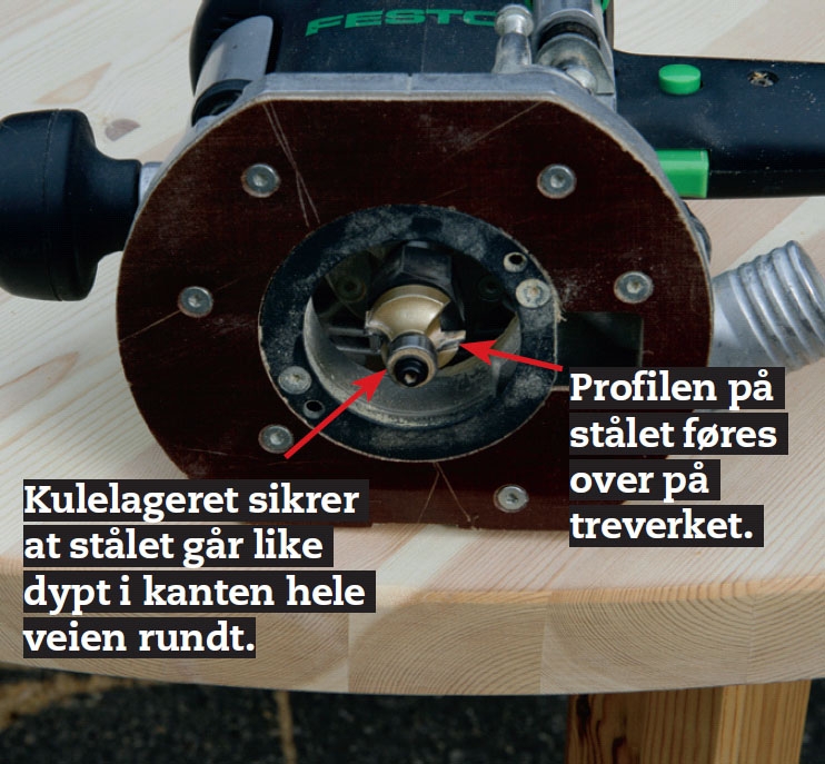 Kanten skal gjenoppbygges - vi tar fram en ny maskin. Overfresen retter raskt og nøyaktig kanten til den profilen fresestålet har. Et kulelager kjører på siden av bordet og styrer arbeidet - du skal bare føre maskinen rundt.