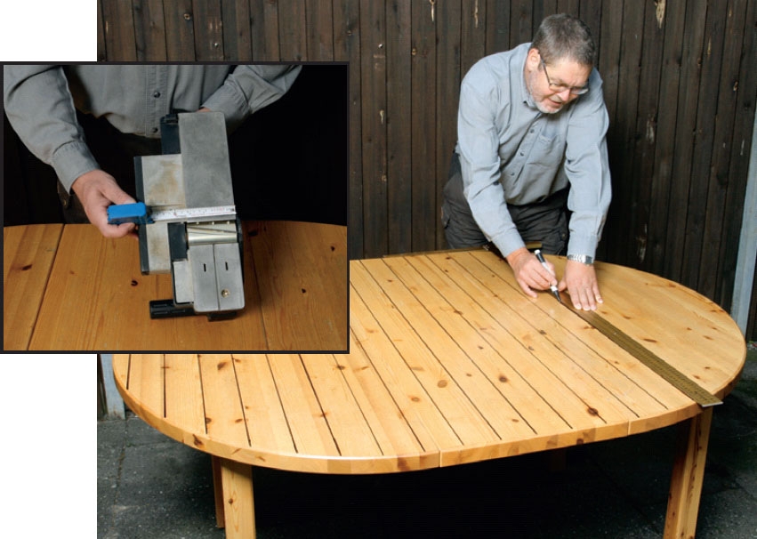 Arbeidet med høvelen planlegges slik at du tar nøyaktig like mye av plata over alt. Slå en rekke parallelle streker på langs av årene med en innbyrdes avstand 5 mm kortere enn det sporet høvelen fjerner.
