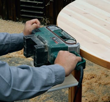 Kanten av bordet slipes også med båndsliperen. For å unngå at lakken brenner seg fast, kjører du først med grovt slipepapir. Hold båndpusseren i konstant bevegelse, både for å bevare rundingen og for å unngå at lakken brenner seg fast.