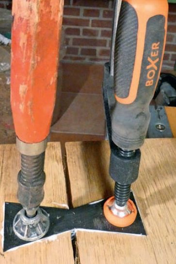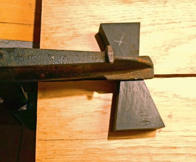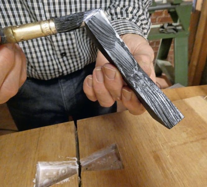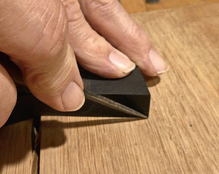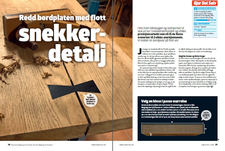 Har du tenkt å felle ned sommerfuglen i kanten av bordplaten som her, kan du holde den fast med en tvinge mens du risser opp kanten med en kniv. Skal den sitte lenger inn på bordplaten, der kjevene på tvingen ikke rekker frem, kan du eventuelt lime den fast midlertidig mens du risser opp målet.