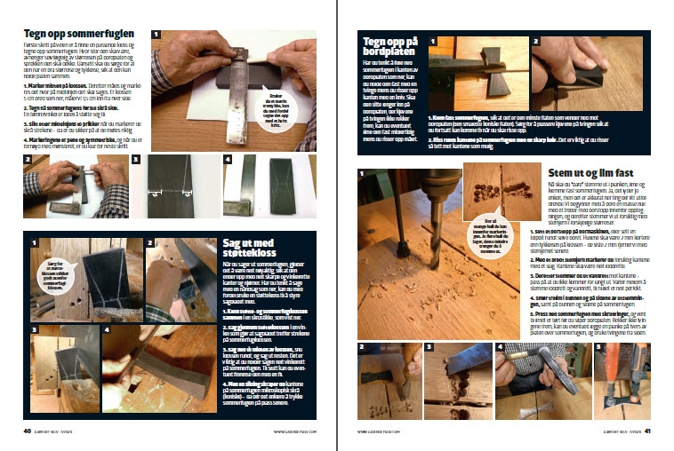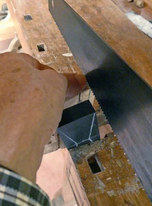 Når du sager ut sommerfuglen, gjelder det å være helt nøyaktig, slik at den ender opp med helt skarpe og vinkelrette kanter og hjørner. Har du tenkt å sage med en håndsag som her, kan du med fordel bruke en støttekloss til å styre sagbladet med.