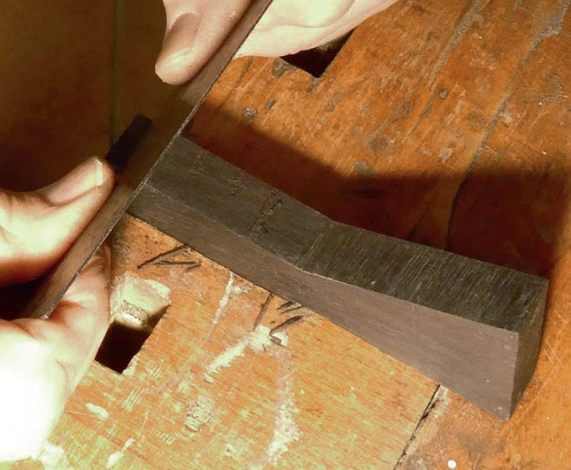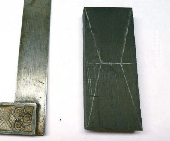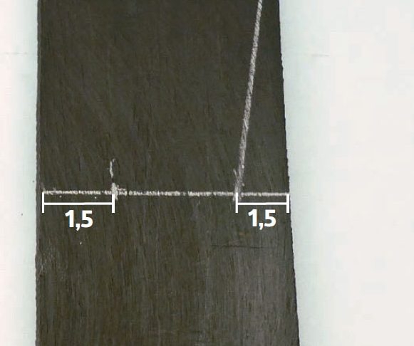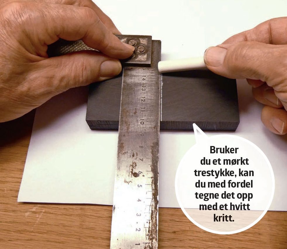 Marker midten på klossen. Deretter måles og markeres det hvor på midtlinjen det skal sages. Er klossen 5 cm bred som her, måler vi 1,5 cm inn fra hver side.