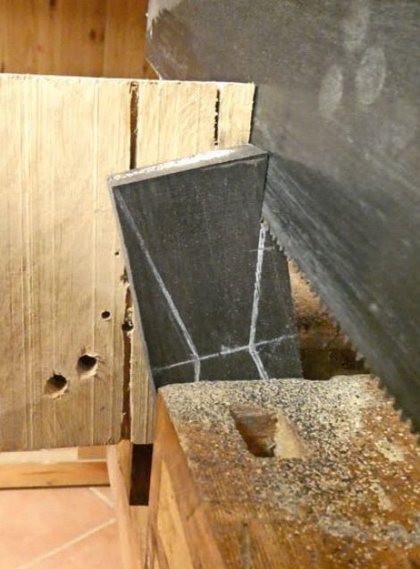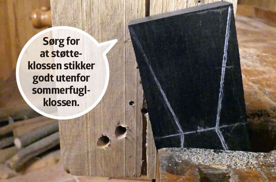 Sag gjennom støtteklossen i en vinkel som gjør at sagbladet treffer strekene på sommerfuglklossen.