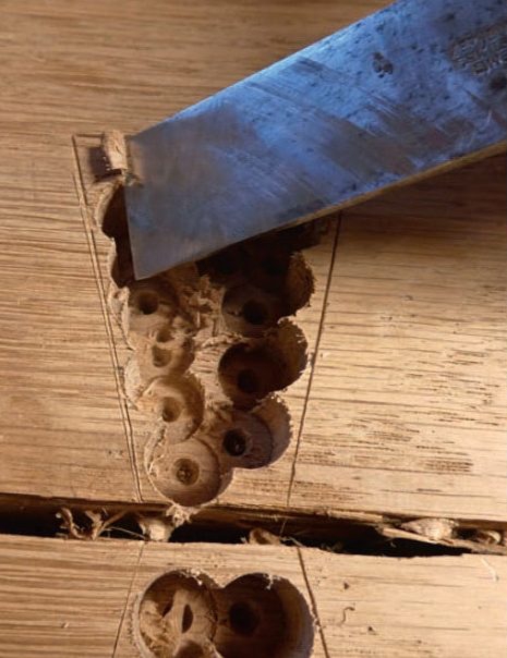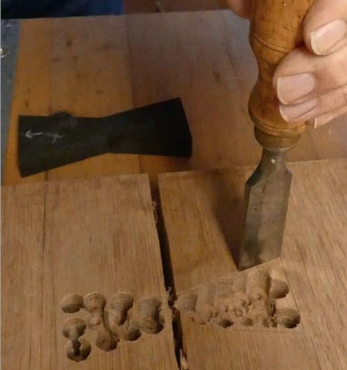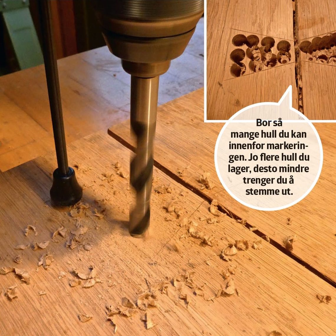 Nå skal du “bare” stemme ut i planken, lime og klemme fast sommerfuglen. Ja, det lyder jo enkelt, men det er akkurat her ting blir litt utfordrende. Vi begynner med å bore en masse hull med et trebor med borstopp innenfor opptegningen, og deretter stemmer vi ut forsiktig med stemjern i forskjellige størrelser.