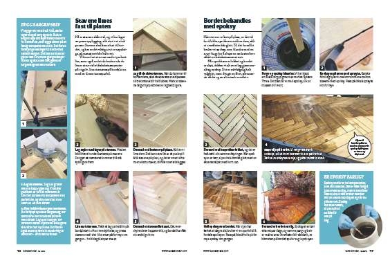 Vi limer fast stavene med et parkettlim, som også er det du bruker når du limer staver til et fiskebeinsmønster på et gulv. Limet smøres på bordplaten med en 4 mm tannsparkel.