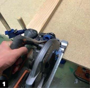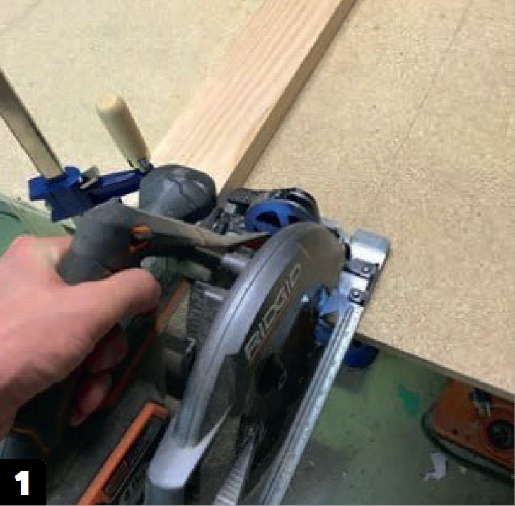 Bordplaten sages til. Her bruker vi en sirkelsag. Vi spenner fast et rett bord med tvinger på platen, slik at vi kan bruke det som anlegg til sagen. Det gir et rett snitt.