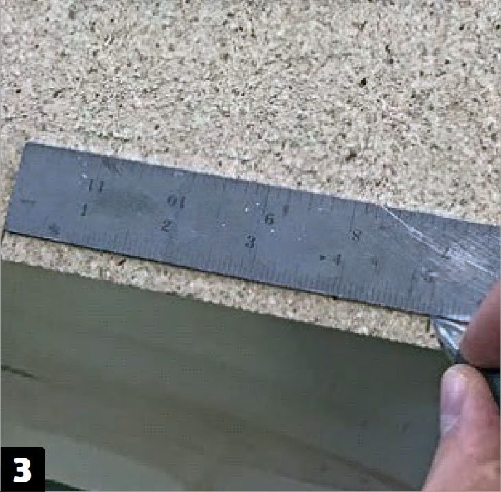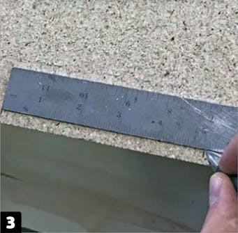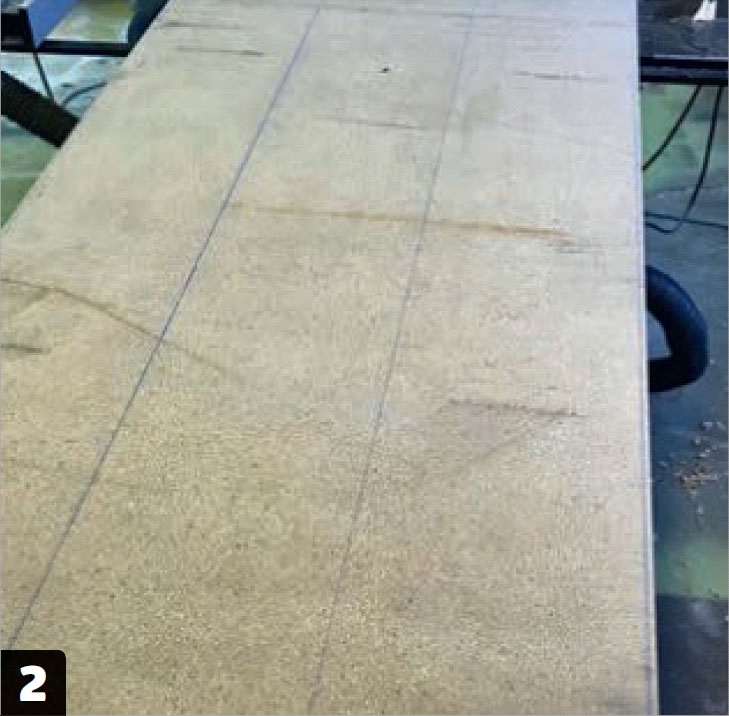 Avsett ekstra plass. Vi merker opp, slik at det er cirka 1 cm plass til overs rundt platen der furustavene skal legges i fiskebeinsmønster. Det skjærer vi vekk til slutt.