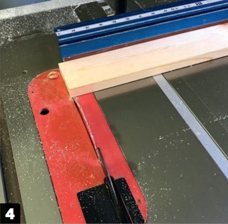 Etterpå skjærer vi til noen hylleplater av furu, slik at de ender opp som staver med en bredde på 7 cm. Det er en stor fordel å ha en bordsirkelsag til dette, men jobben kan fint klares også med en vanlig sirkelsag.