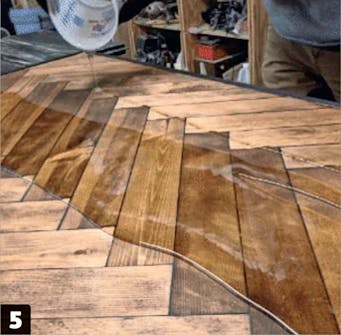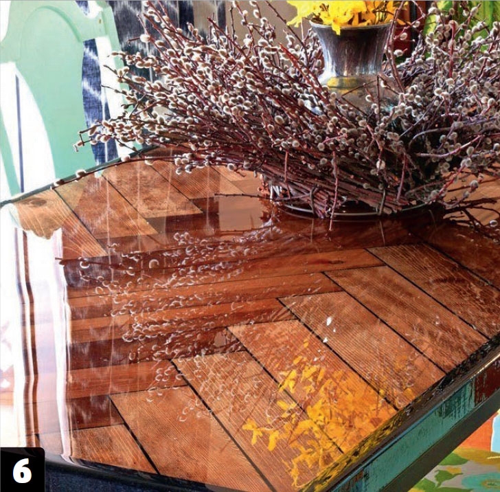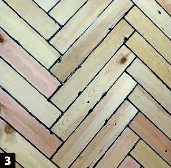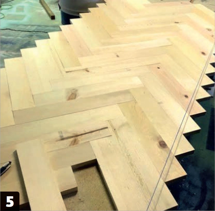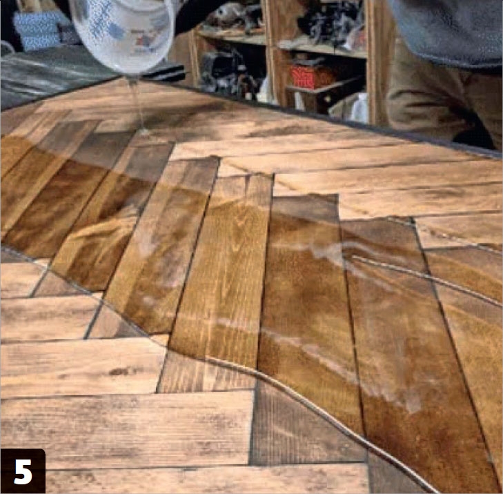 Når stavene er limt på plass, er det tid for å lukke sprekkene mellom dem, slik at overflaten blir glatt. Til det formålet bruker vi epoksy, som blandes med en svart farge for å skape en enda sterkere effekt av fiskebeinsmønsteret.