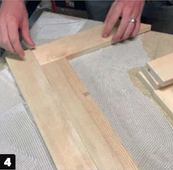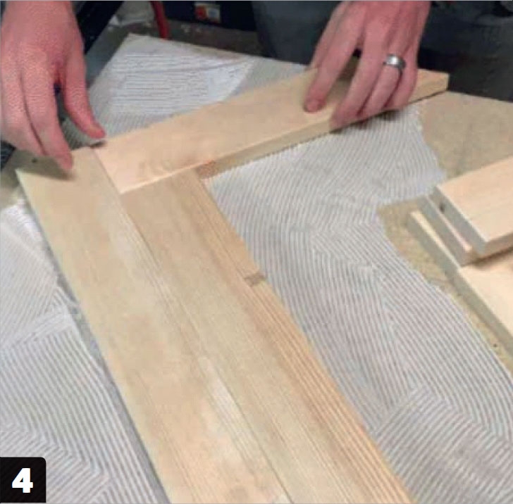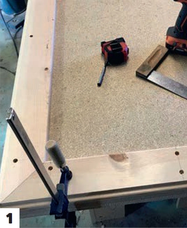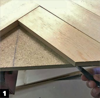 Lag en ramme. Sag i 45 grader med en kapp-/gjærsag. Vi bruker glattkant av furu til rammen vår. Lim fast bordene til bordplaten med parkettlim, og skru dem fast med noen 4 x 40 mm skruer.