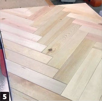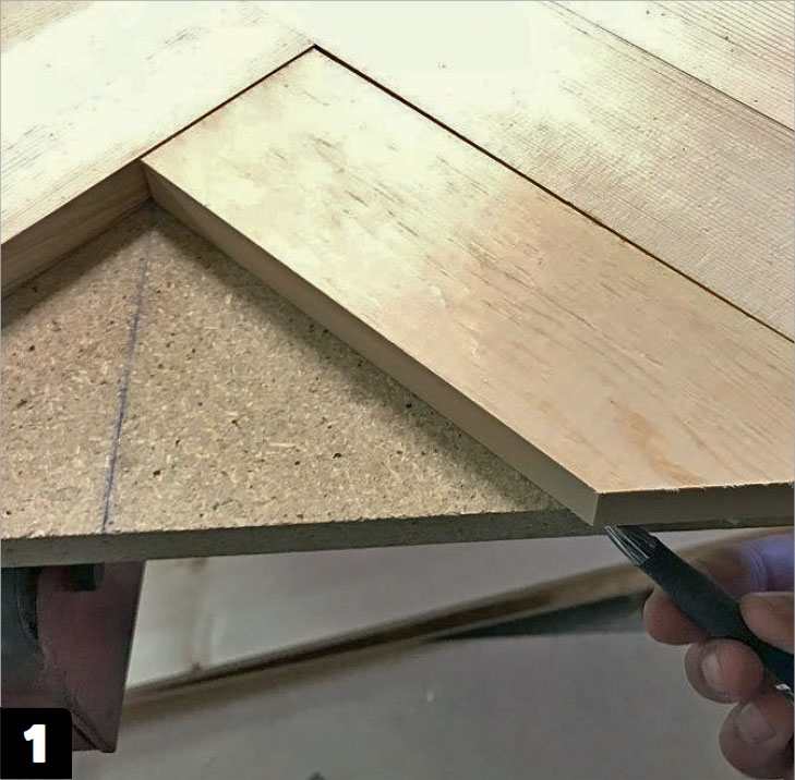 Sag til de siste stavene. Når du kommer til bordendene, skal de siste stavene tilpasses så trekantene blir helt lukket. Merk at stave ne følger hjelpestreken vi lagde tidligere.