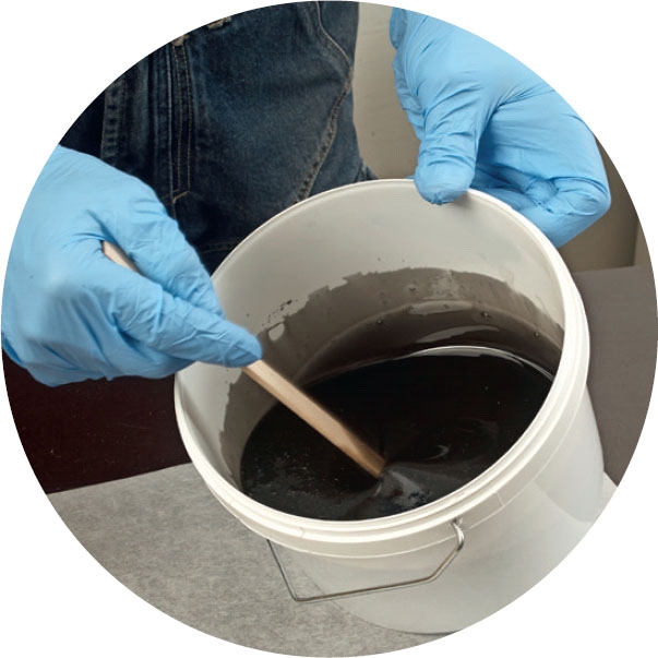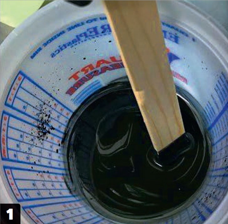 Farge og epoksy blandes. Vi har kjøpt en flaske fargepigment av merket System Three. Det blander vi med epoksy, slik at massen blir svart.