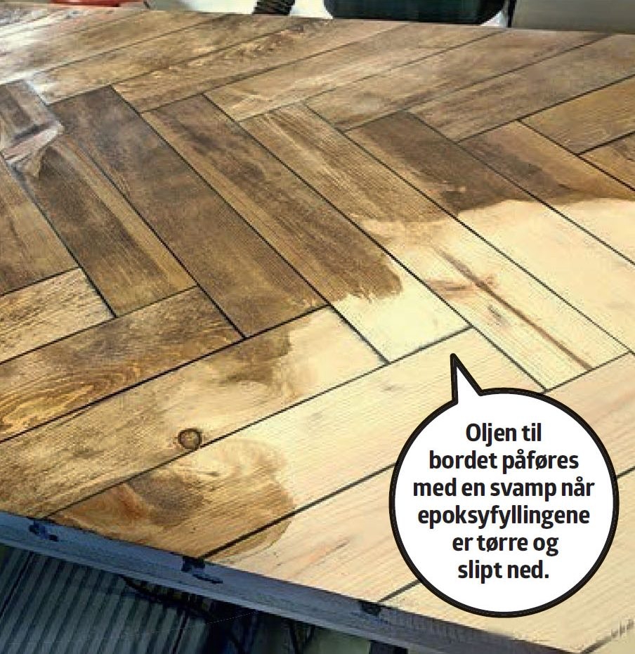 Hell epoksy over bordet. Når oljen har tørket et døgns tid, bruker vi en sparkel til å fordele epoksyen. Pass på ikke å helle på for mye epoksy om gangen.