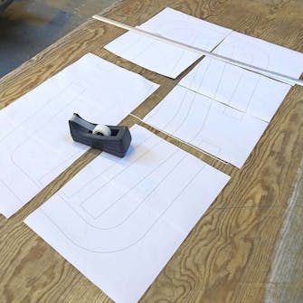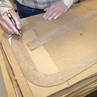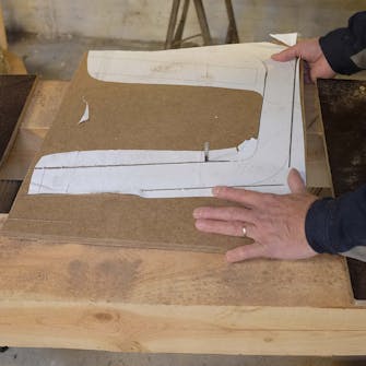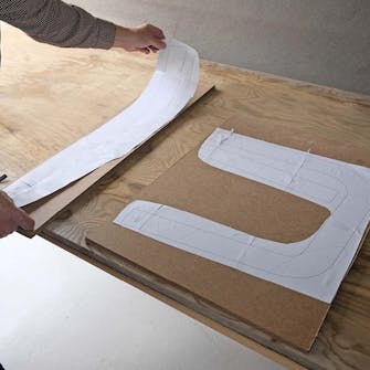 Etter noen dagers tørketid bruker vi malen vi laget av masonittplater til å tegne elementene til ryggstøtten og setet inn i pappen.