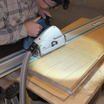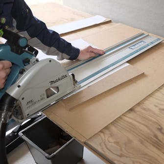 Sag alle de rette stykkene med en dykksag. På dykksagen er det et merke som viser hvor den starter å sage. Det trenger du til dette prosjektet. Dykksagen skjærer cirka 56 mm dypt, og platene er 70 mm tykke, så sagbladet når ikke helt igjennom. Derfor må du skjære det siste med stikksagen.