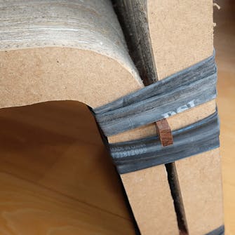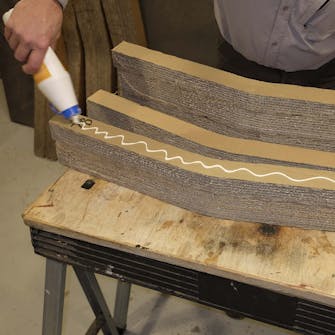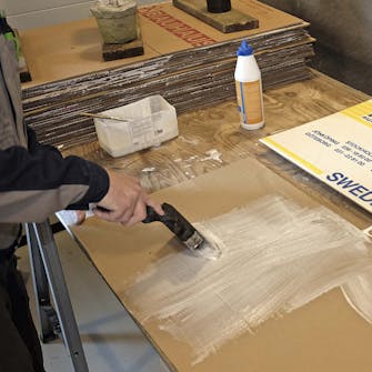 Smør lim på papplatene, og lim dem sammen. Lim sammen så mange biter at pappen til slutt blir cirka 7 cm tykk. Påfør limet med en bred pensel og ta en plate av gangen. Hvis limet er for tykt, kan du fortynne det med cirka 5 prosent vann. Til slutt legger du noe tungt over pappen og lar den tørke i 3-4 dager.