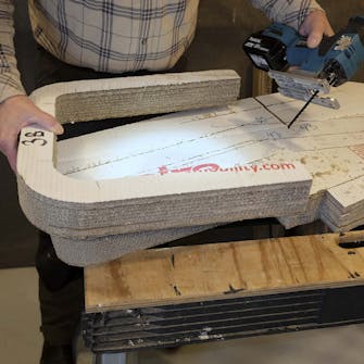 Nå bruker du masonittmalene til å skjære ut rygg og sete. Papplatene her er 47 x 100 cm, noe som er stort nok til å skjære ut to rygger og to seter av hver. Det må altså skjæres til totalt 6 av de 7 cm tykke bitene for å få nok til våre to stoler, som er 42 cm brede i både sete og rygg.