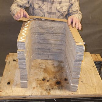 Vi limer pappeskene sammen til de når en tykkelse på 7 cm. Vi trenger 6 av disse til både sete og rygg, slik at stolen blir 42 cm bred når den limes sammen senere.