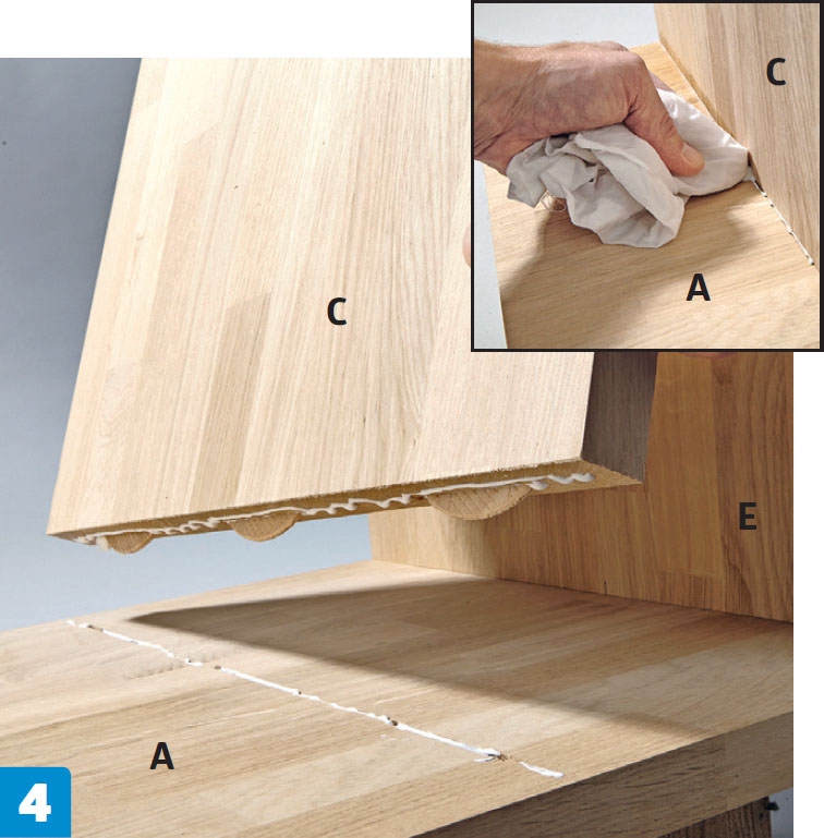 Bordet settes sammen. Det er lameller i alle utfresinger, og vi er klare til å sette sammen bordet. Tørk av overskytende lim med papir eller en klut.
