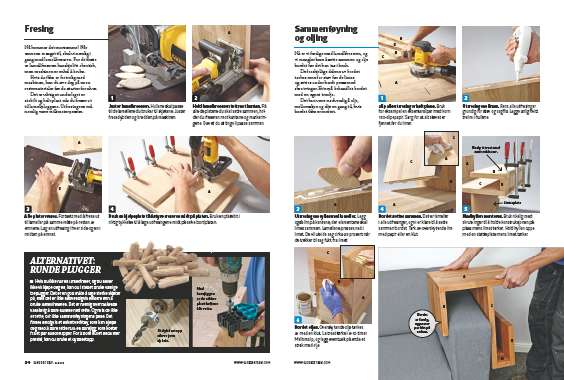 Hvis du ikke har en lamellfreser, og du heller ikke vil kjøpe deg en, kan du i stedet bruke vanlige treplugger. Det er en god måte å lage sterke skjøter på, men det er ikke nødvendigvis enklere enn å bruke lamellfreseren. Det er nemlig overraskende vanskelig å bore hullene helt rette. Og hvis de ikke er rette, blir ikke sammenføyningene pene. Det finnes heldigvis et enkelt verktøy, som kan hjelpe deg med å bore rette hull: en borejigg, som koster fra et par hundrelapper. For å bore hullet enda mer presist, kan du bruke et dybdestopp.