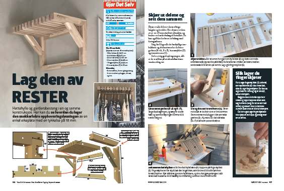 Sett sammen hattehyllen ved å lime fast hyllelistene (A) i tappene på fingerstykket (E). Fingerstykket er her skjult bak den lange listen, som brukes til å holde sammen konstruksjonen. Kjør stålrøret gjennom hyllelistene, og skru fast gjengestangen i stålrøret med mutterne. Hold hattehyllen midlertidig sammen mens limet herder.