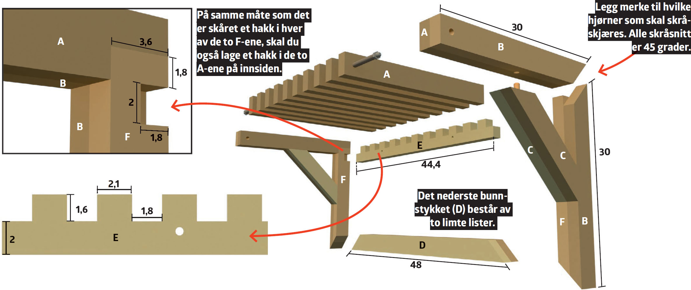 Sørg for å lage alle de forskjellige innhakkene og skråsnittene før du limer gavlene (B + A, B + F), bunnstykket (D) og tverrstiverne (C).
