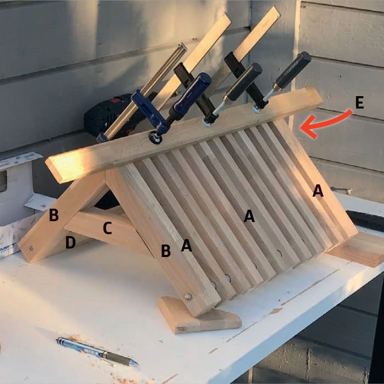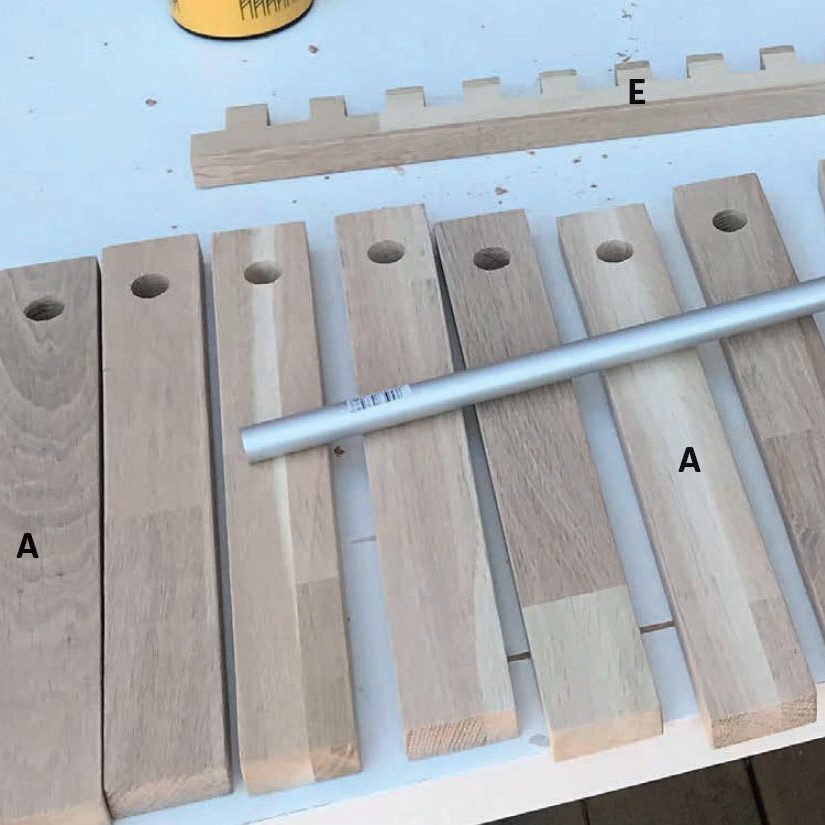 Skjær ut delene. Bor et 8 mm hull gjennom hyllelister (A) og de to vannrette endelistene (B) (synes ikke på bildet). Hullene bores i midten av listene med en senteravstand til enden på 18 mm. Lag også fingerstykket (E).