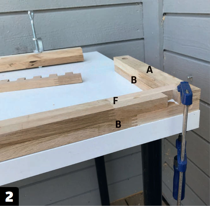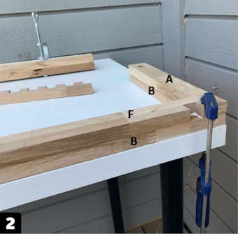For å lage fingerstykket (E) bakerst, der hyllelistene (A) skal limes fast, skal du lage fingerskjøter. De kan du lage med en listesag og et skarpt, smalt stemjern.
