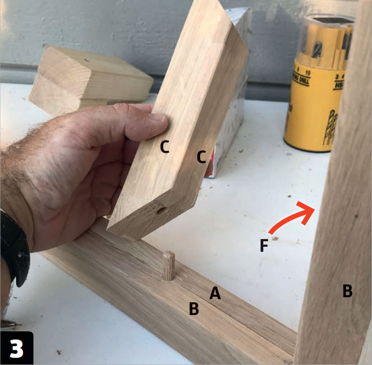 Lim og skru fast tverrstiverne (C). Stiverne består av to deler som er limt sammen. De monteres med plugger i de vannrette gavlene (B + A), mens de i de loddrette (B + F) skal ha en passende skrue.