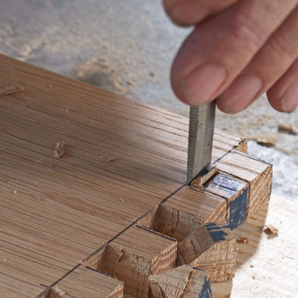 Begynn med å streke opp hvor brede og dype tappene skal være, sag kantene (sørg for at de blir helt rette), og avslutt med å stemme bunnen plan med et skarpt stemjern.
