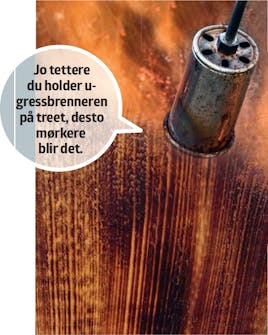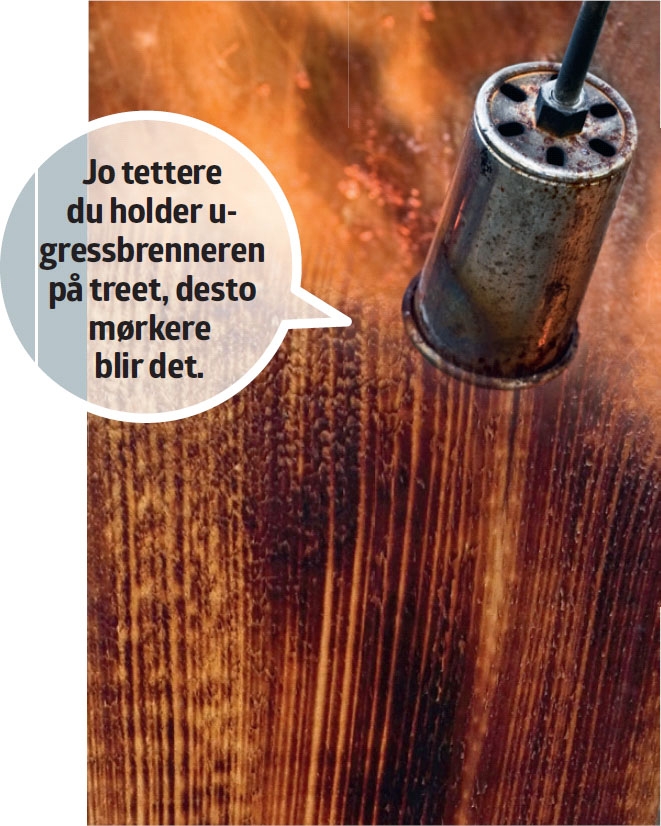 Panelbordene er kappet til i lengden og skåret rett på de langsidene som skal støte inn mot veggen. Den uregelmessige og organiske kanten beholdes på forkanten. Det brente utseendet på overflaten er laget med en ugressbrenner. Overflaten er også slipt, før bordene til slutt har fått en omgang med lakk.