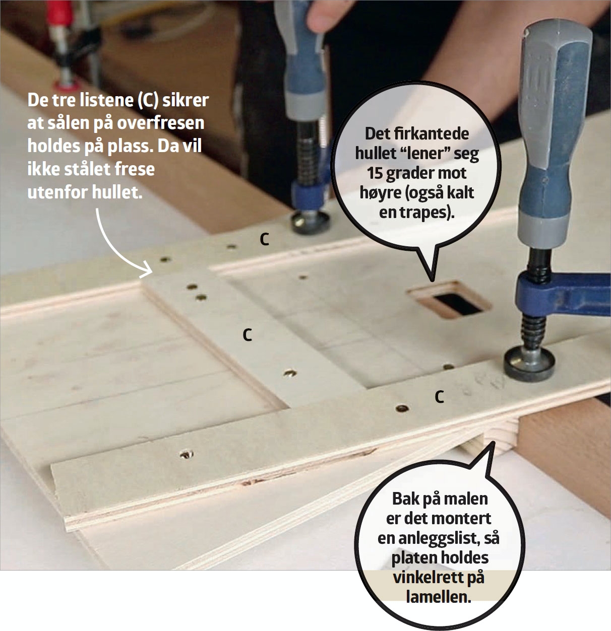 Sidelistene (C) stopper overfresen. Når sålen til overfresen støter mot sidene i malen, har utfresingen riktig størrelse.