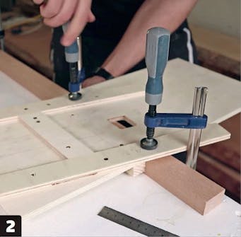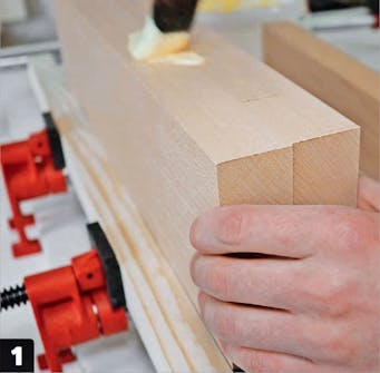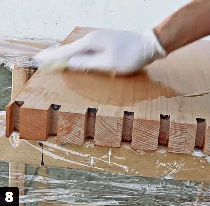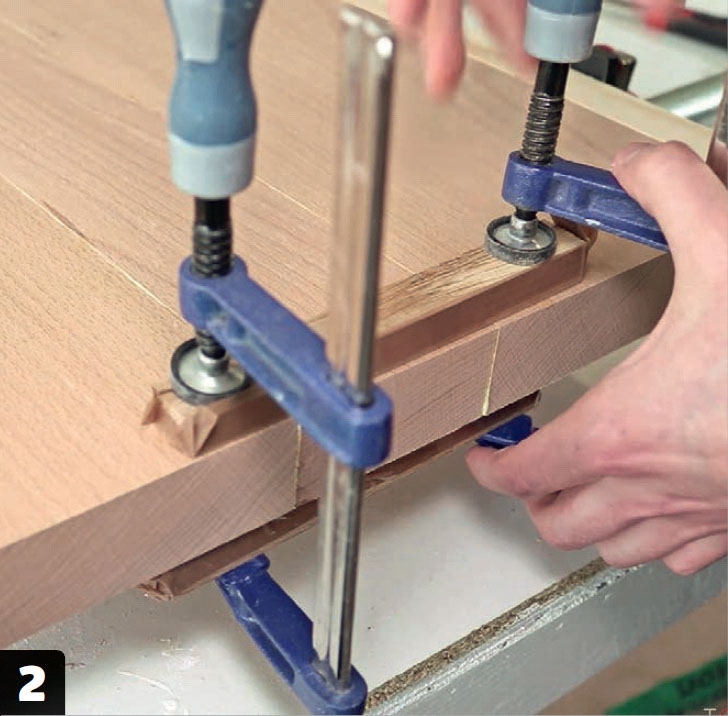 Emnene presses mot hverandre. Det gjelder å presse godt, så store skrutvinger settes på tvers, mens mindre skrutvinger støtter sammenføyningene så de flukter. La limet herde i et døgns tid.