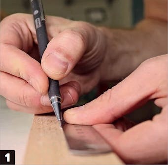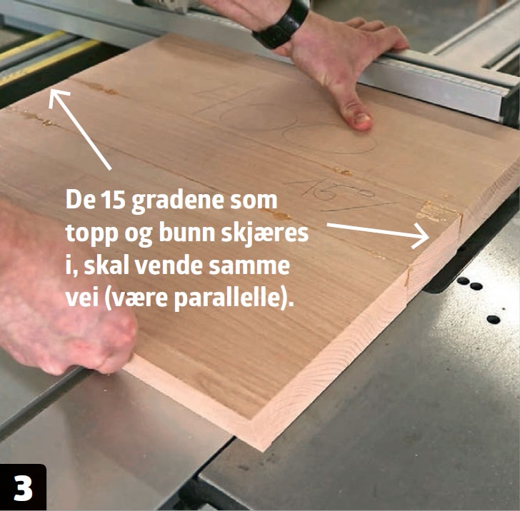 Beina skjæres i en 15 graders vinkel i topp og bunn. Tegn opp hvor slissene skal freses. Det er nå du med fordel kan bruke et av beina til å tegne etter på lamellmalen - dermed blir du sikker på vinklene.