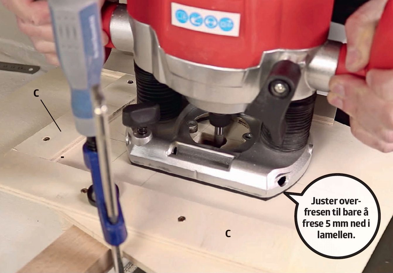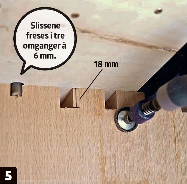 Fresedybden på begge sider av lamellene er 5 mm, og dermed blir tappen (det gjenværende treet mellom fresingene) 12 mm - altså nøyaktig samme bredde som slissene i beina.