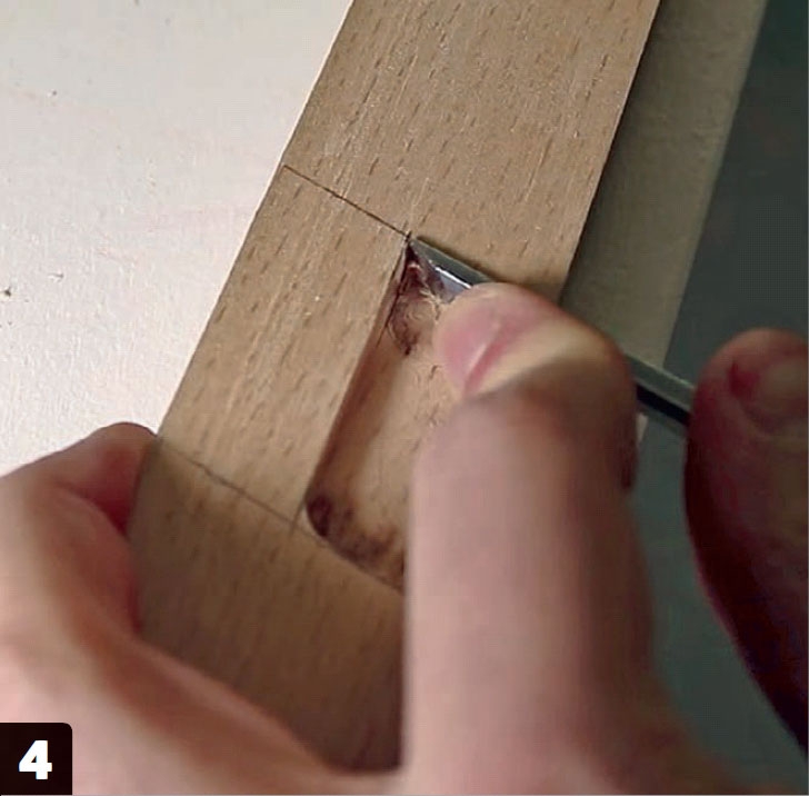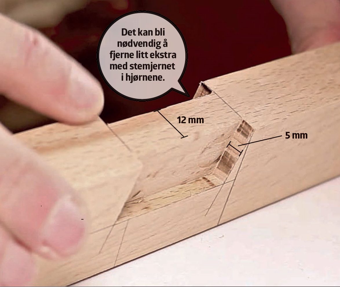 Hjørnene stemmes ut. Overfresen kan ikke komme helt ut i hjørnene, så det siste treverket må fjernes med et knivskarpt stemjern. Her skal du være veldig nøyaktig.