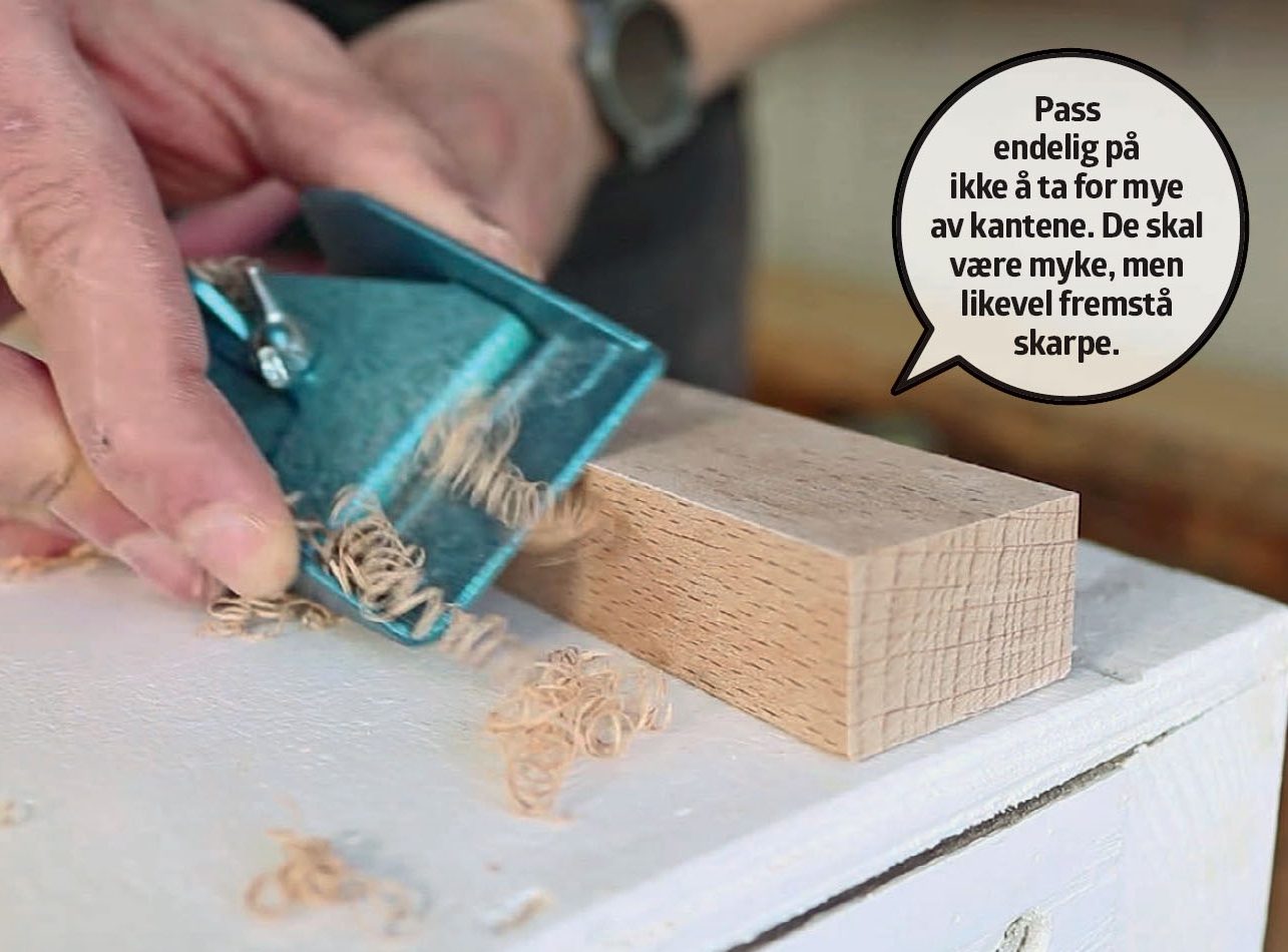 Alle kanter avfases. På lameller og bein skal alle kanter være glatte. Derfor bruker vi en avfaserhøvel med et knivskarpt blad.