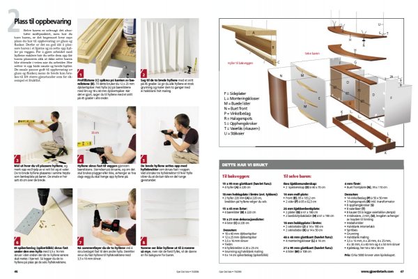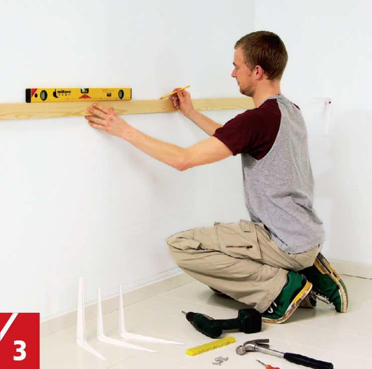Mål ut hvor du vil plassere hyllene, og merk opp ved hjelp av ei rett list og et vater. De to brede hyllene plasseres i samme høyde som benkeplata på baren. De smale er her satt 45 cm over de brede.