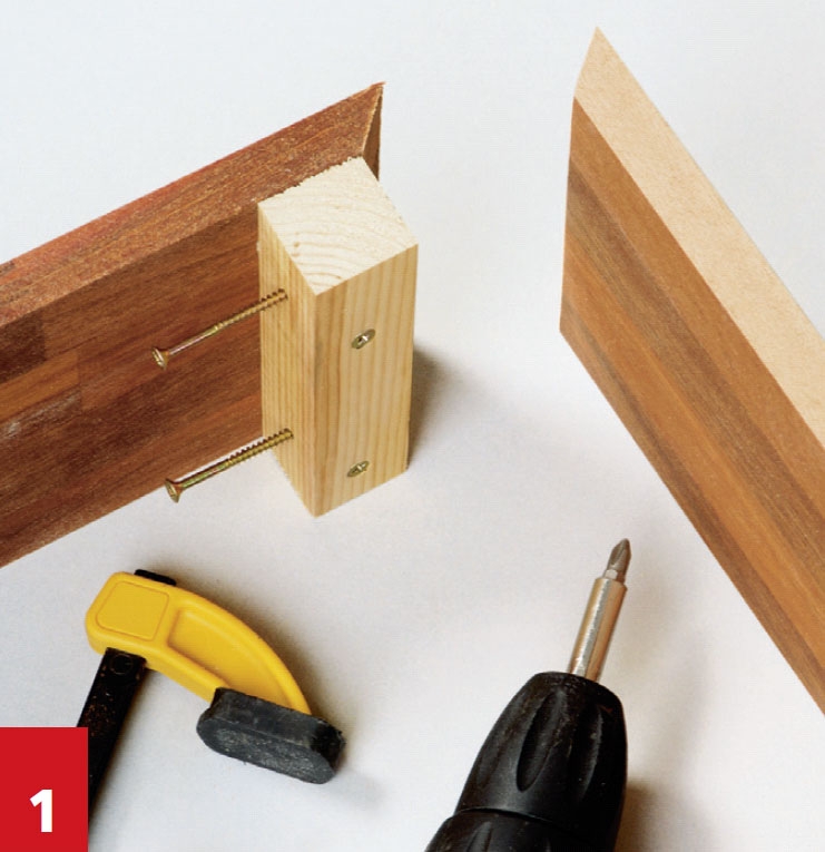 Begynn med sokkelen. De fire monterings-klossene (L) skrus på i enden av sokkelsidene med 4 x 50 mm skruer. Sidene er saget i en vin-kel på 45 grader i endene som du smører lim på og holder i spenn mens du setter i skruer.