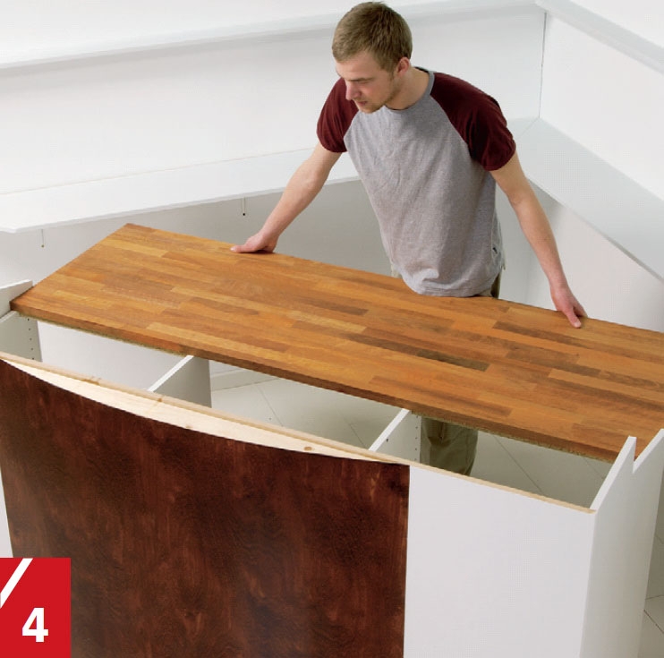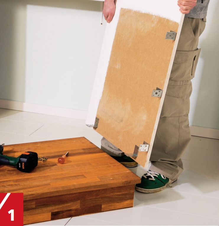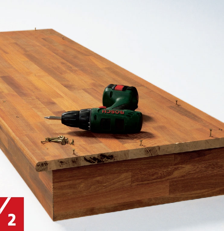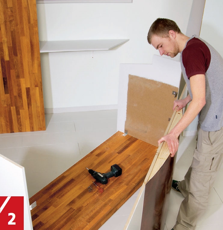 Benkeplata skyves på plass oppå de to skapene og festes med 4 x 40 mm skruer gjennom listene i toppen av skapene.