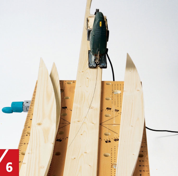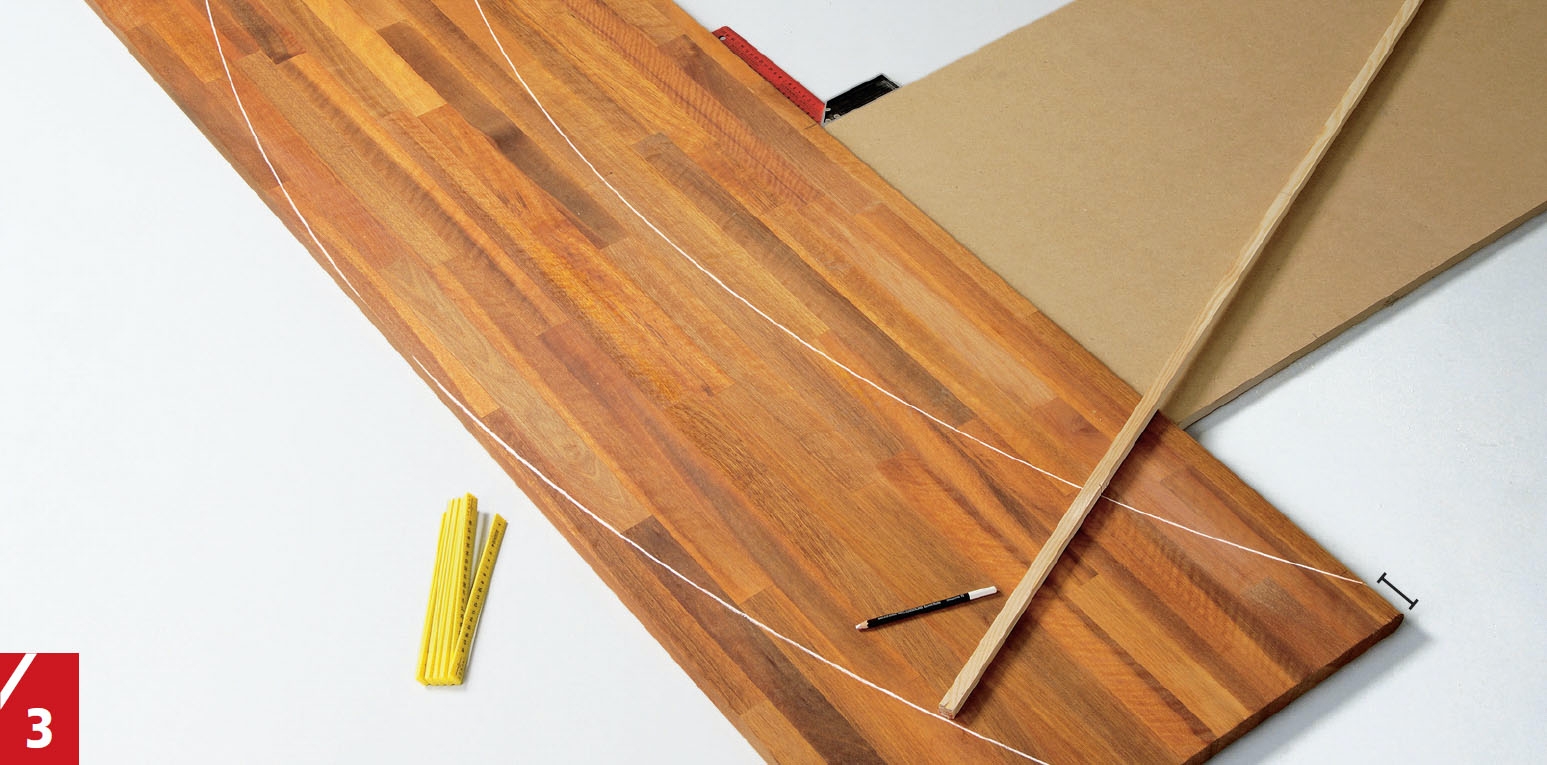 Også til de buede listene (M) bruker du den hjemmelagde passeren. Legg emnet til ei list oppå barplata, og tegn buen slik at du får ei list som er 8 cm på det bredeste stedet.