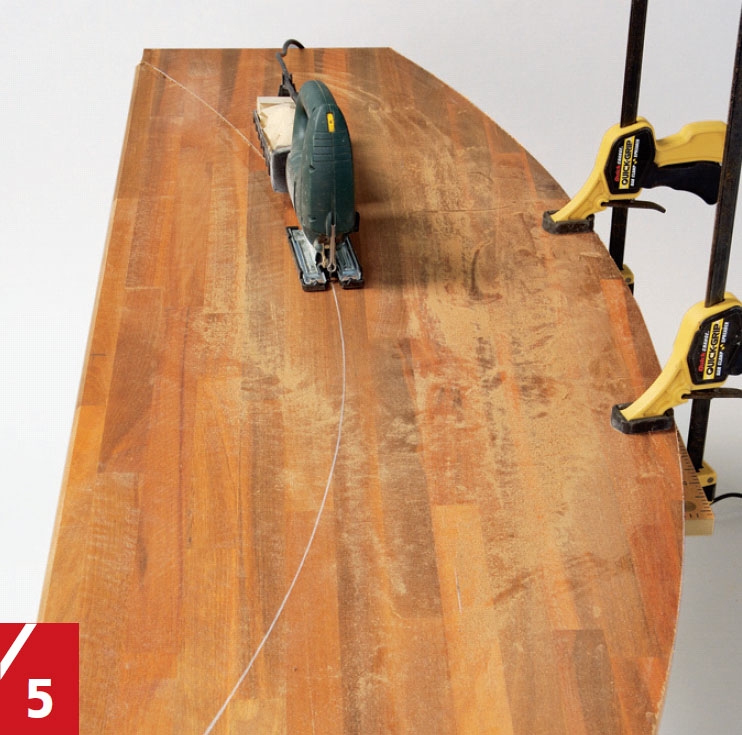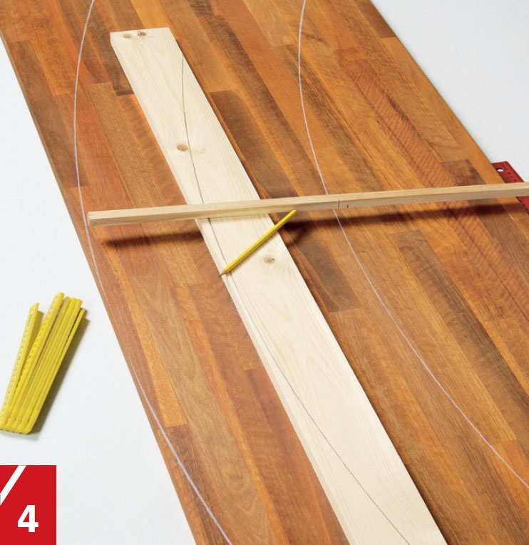 Bueformen på bardisken lager du ved hjelp av en hjemmelaget «passer». Legg plata som skal bli bardisk vinkelrett mot for eksempel ei sponplate, og pass på at den stikker like mye ut på begge sider. Sag til ei list slik at den blir 220 cm, og fest den med en spiker 200 cm fra fram-kanten. Dra så den første buen som tangerer framkanten. Neste bue skal skjære den bakre kanten 5 cm fra de begge indre hjørnene.