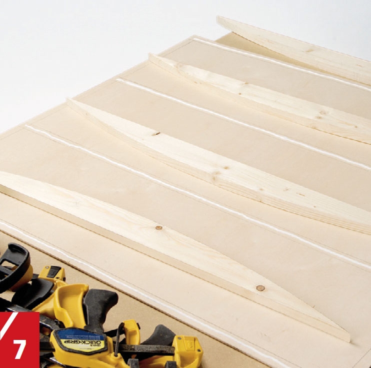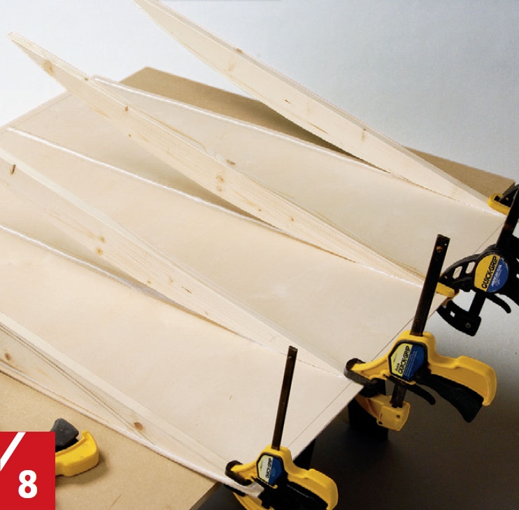 Listene spennes fast til plata. Først alle listene på den ene siden og så på den andre slik at plata blir bøyd som listene. La limet tørke skikkelig før du løser tvingene igjen.