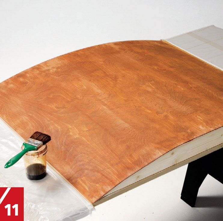 Nå skal buen behandles slik at den står til det mørke treet i benkeplatene. Beis buen med spritbeis. Så sliper du lett med fint slipe-papir og gir den eventuelt enda et strøk beis. Til slutt lakkerer du tre til fire ganger med en halvblank interiørlakk.