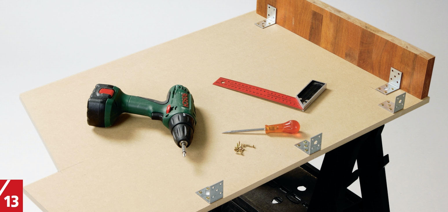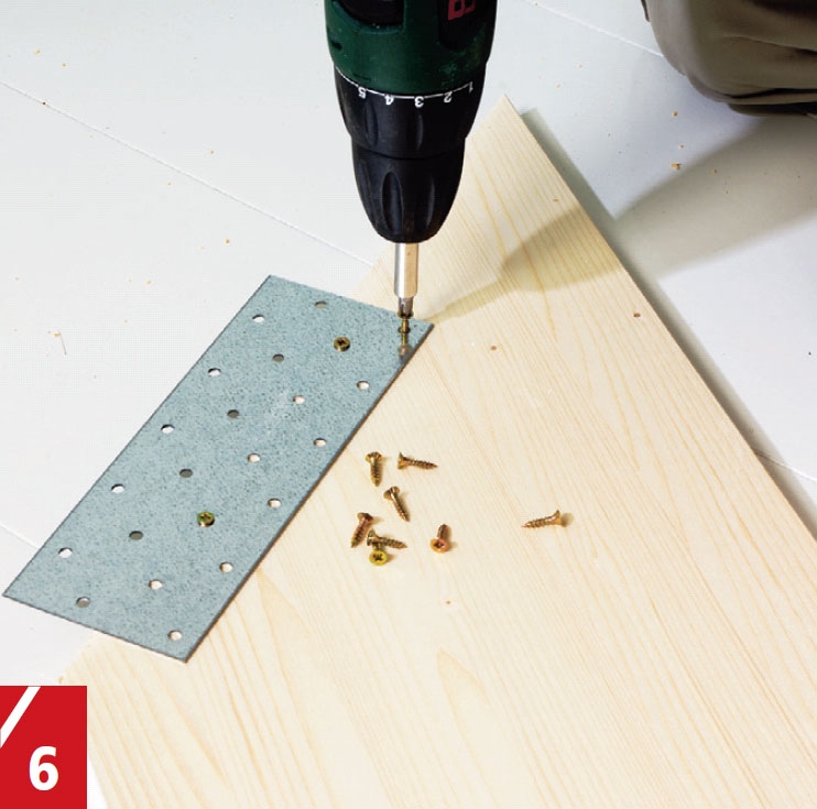 Et spikerbeslag (spikerblikk) skrus fast under den ene hylla med 3,5 x 16 mm skruer i den enden der de to hyllene senere skal møtes i hjørnet. Så legger du de to hyllene på plass på de seks hylleknektene.