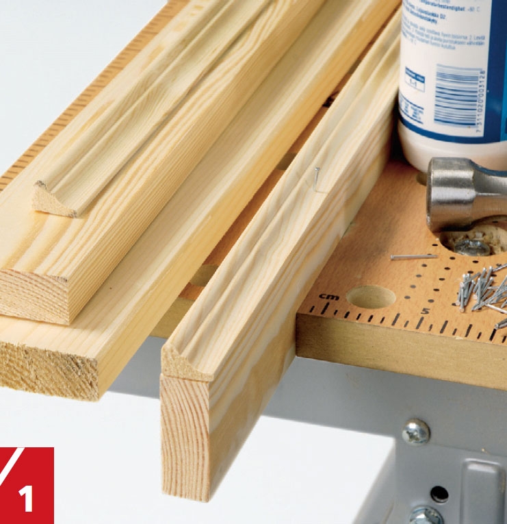 Profillistene (C) spikres på kanten av bæ-relistene (B). Til dette bruker du 12 x 25 mm dykkertspiker. Fest hylla (A) på bærelistene med lim og 18 x 40 mm dykkertspiker. Når det er gjort, sager du til hyllene med et snitt på 45 grader i alle ender.