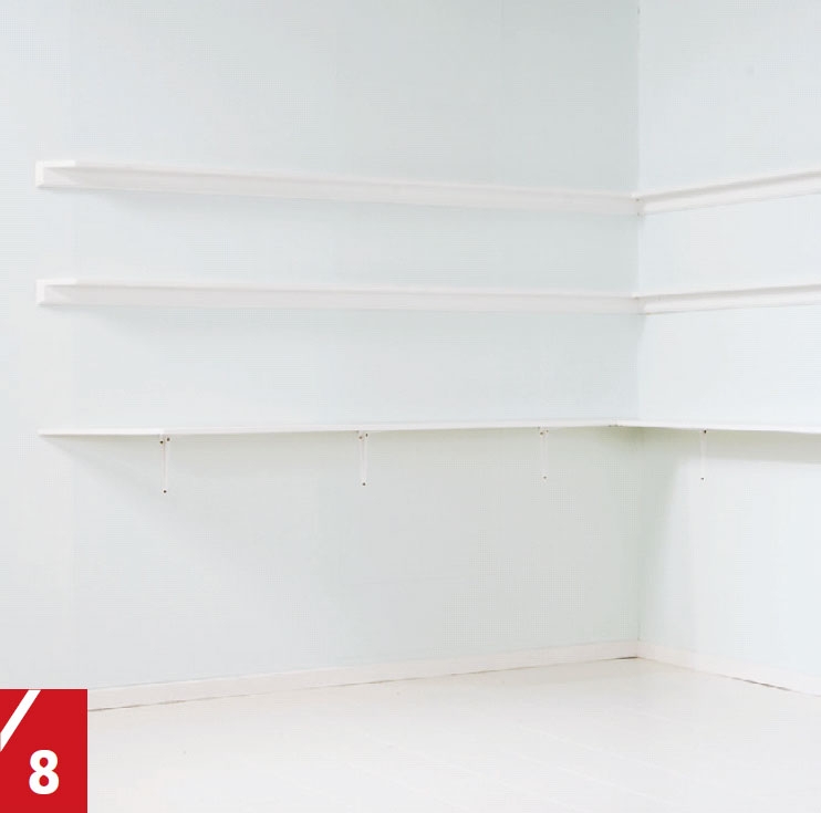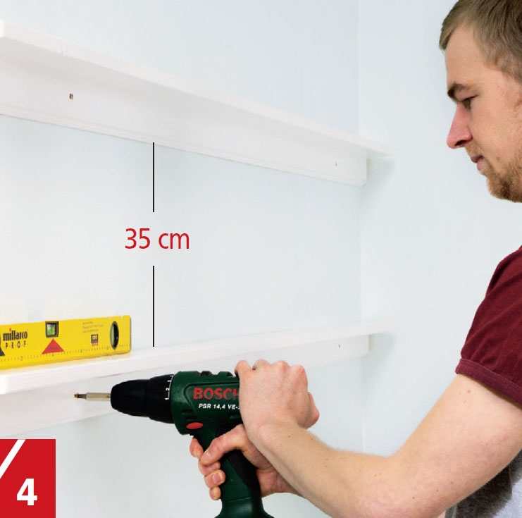 Selve baren er selvsagt det abso-lutte midtpunktet, men har du bare baren, er det begrenset hvor mye plass du har til oppbevaring av glass og flasker. Derfor er det en god idé å plas-sere baren i et hjørne og så sette opp hyl-ler på veggen. For å gjøre arbeidet med hyllene enklere bør du sette dem opp før baren plasseres slik at ikke selve baren blir stående i veien når du arbeider. Her setter vi opp både smale og brede hyller. De smale passer godt til oppbevaring av glass og flasker, mens de brede kan bru-kes til litt større gjenstander som for ek-sempel et fruktfat.